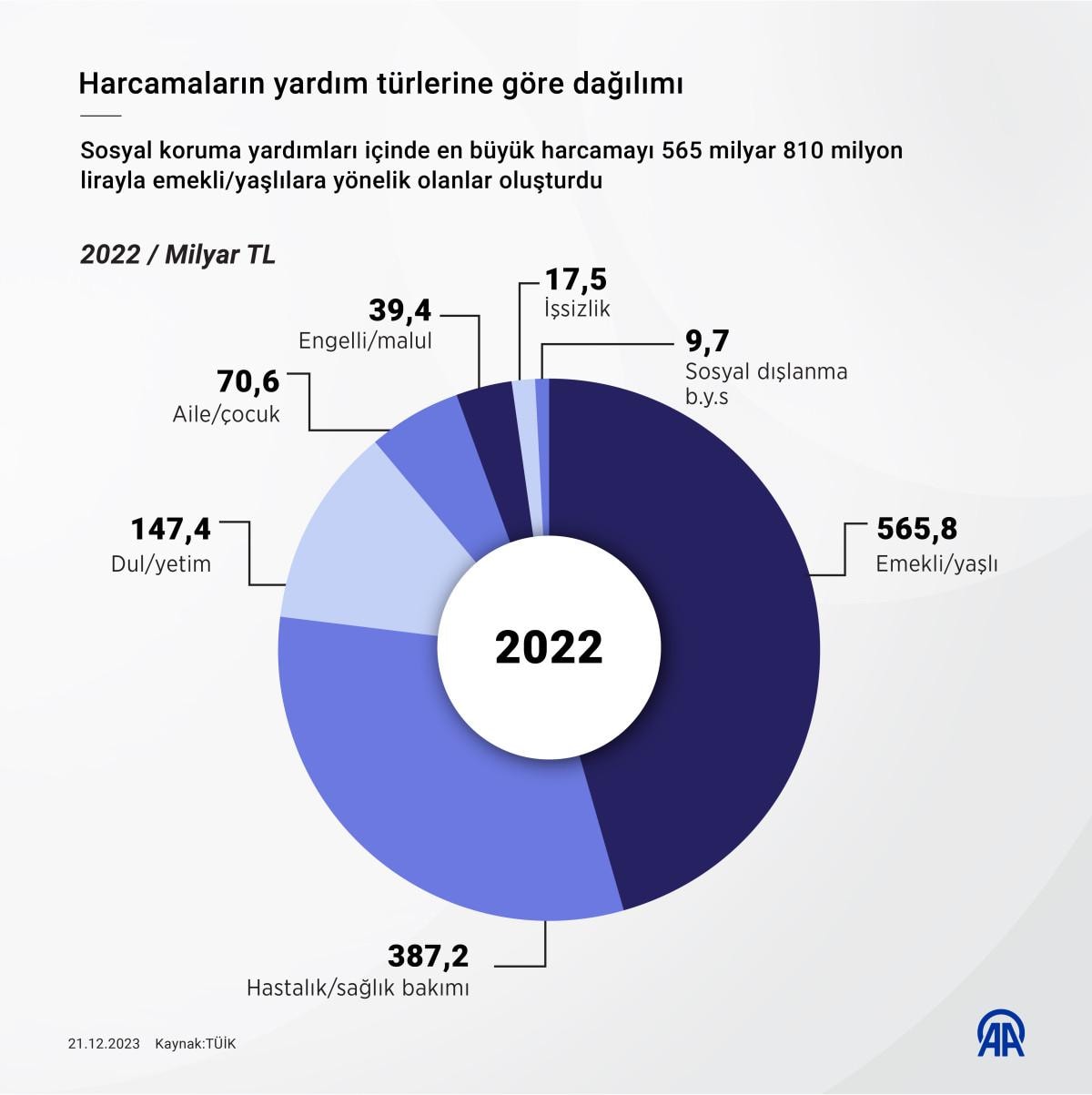 Bu harcamanın yüzde 98,4'ünü 1 trilyon 237 milyar 645 milyon TL ile sosyal koruma yardımları oluşturdu. Sosyal koruma yardımlarında ise en büyük harcama 565 milyar 810 milyon TL ile emekli/yaşlılara yapılan harcamalar oldu. Bunu 387 milyar 221 milyon TL ile hastalık/sağlık bakımı harcamaları takip etti.