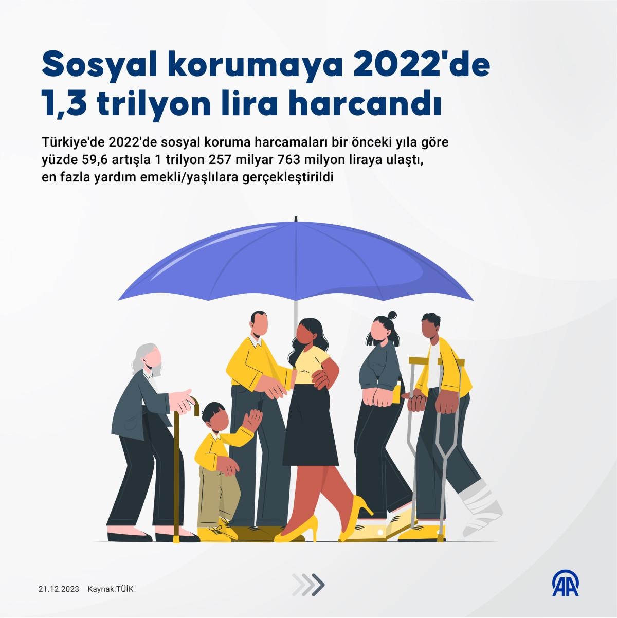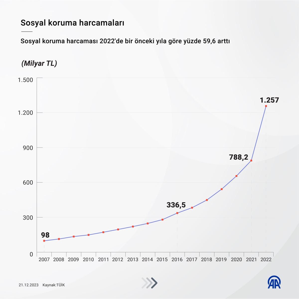Sosyal koruma harcaması 2022 yılında, bir önceki yıla göre yüzde 59,6 artış göstererek 1 trilyon 257 milyar 763 milyon TL oldu.