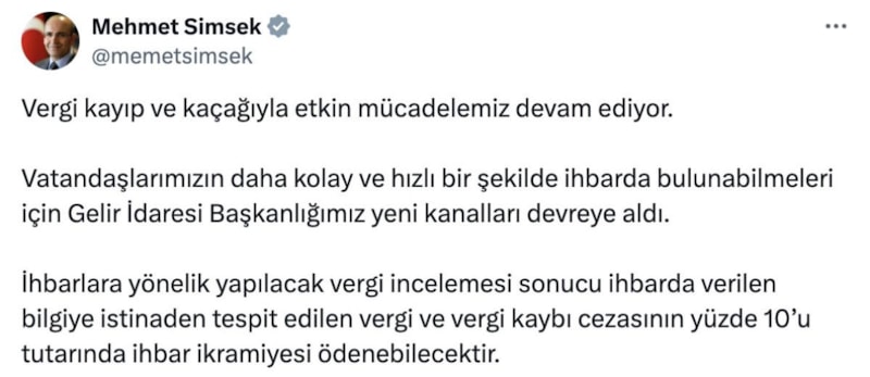 Hazine ve Maliye Bakanı Mehmet Şimşek, vergi ihbarlarının sosyal medyadan yapılması ile ilgili çalışma hakkında bir paylaşım gerçekleştirdi. Bakan Şimşek, paylaşımında GİB'e göre ihbar edilebilecek 10 konu da yer aldı.