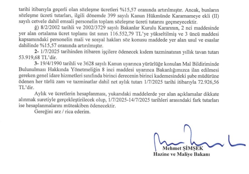 Hazine ve Maliye Bakanı Mehmet Şimşek, sözleşmeli personellerin ücret tavanlarına ilişkin genelgeye imza attı.