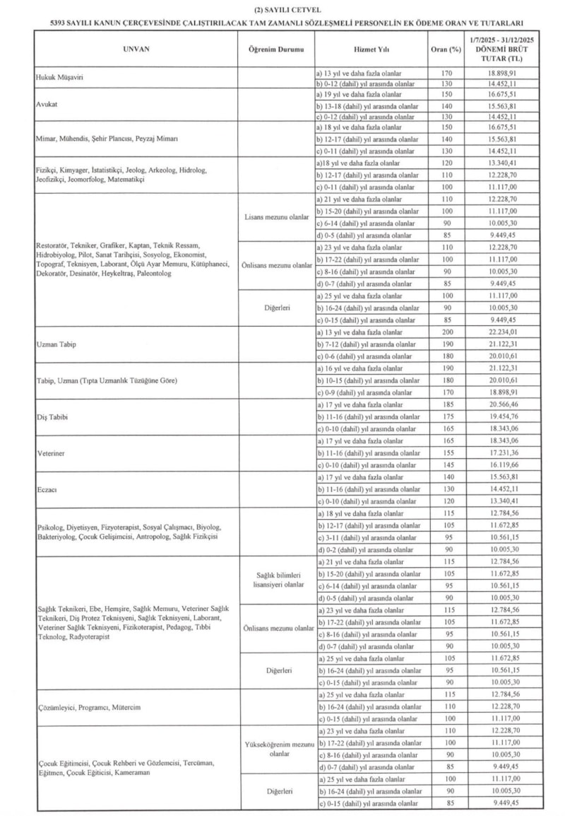 Ayrıca sözleşmeleri bu yıl sonu bitecek olan personeller için 15 Aralık 2025-31 Aralık 2025 tarihleri arasındaki 17 günlük süre için 15 Aralık 2025 tarihi itibarıyla geçerli olan aylık net sözleşme ücretinin 17/31'i kadar, ek ödemenin de 17/31'i kadar ödeme yapılacak.