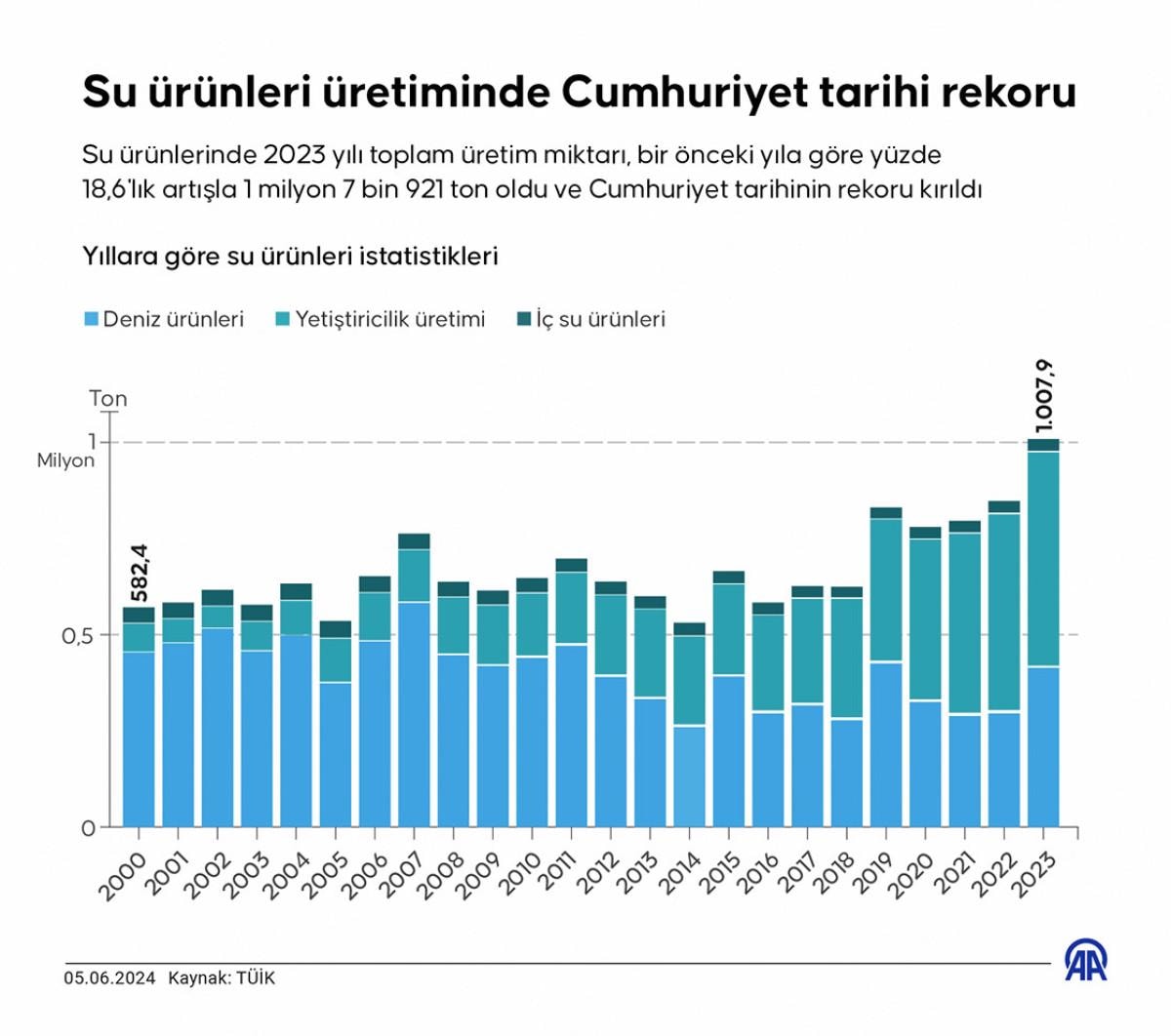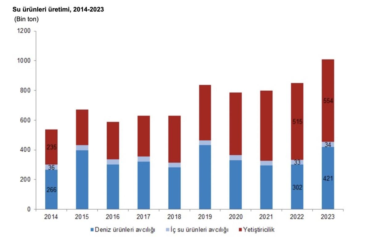 Su ürünleri üretimi 2023 yılında, bir önceki yıla göre yüzde 18,6 artarak 1 milyon 7 bin 921 ton olarak gerçekleşti.