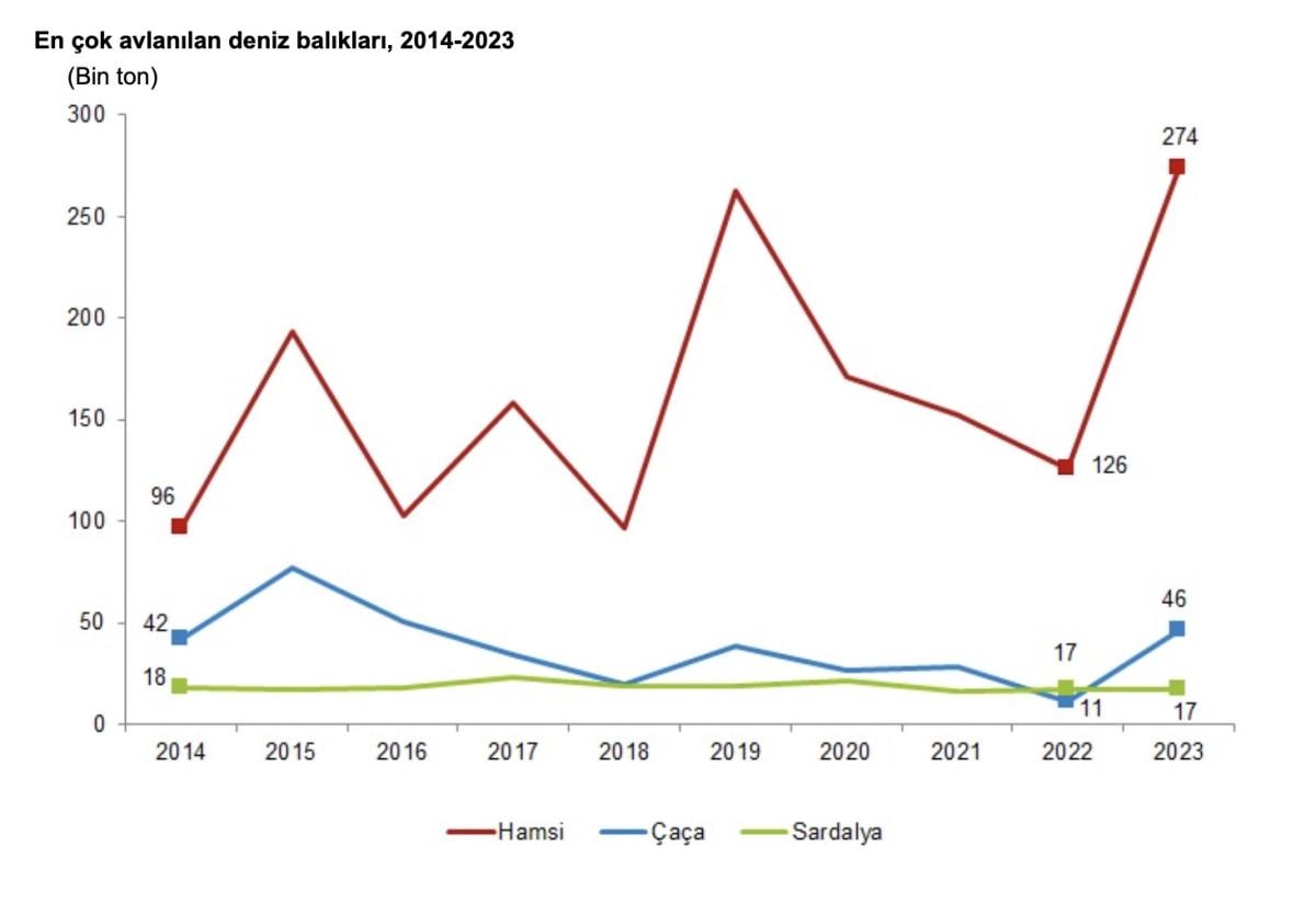 Avlanan deniz balıklarının türlerine göre dağılımı incelendiğinde, hamsi balığının 273 bin 915 ton ile en yüksek miktarda avlanan balık olduğu görüldü. Hamsi balığını 45 bin 764 ton ile çaça ve 17 bin 311 ton ile sardalya takip etti.