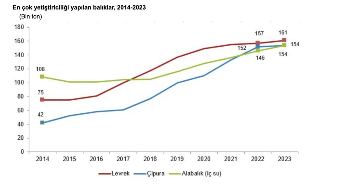 Yetiştiricilik yoluyla yapılan üretimin 2023 yılında 399 bin 529 tonu (yüzde 72,1) denizlerde, 154 bin 333 tonu (yüzde 27,9) iç sularda gerçekleşti. Yetiştirilen en önemli balık türleri iç sularda 154 bin 6 ton ile alabalık, denizlerde ise 160 bin 802 ton ile levrek ve 154 bin 11 ton ile çipura oldu.