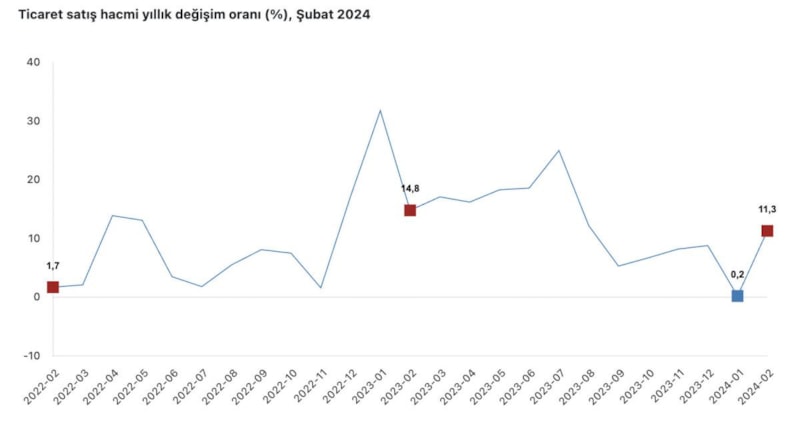 TÜİK, şubat ayına ait perakende satışları açıkladı. Ticaret satış hacmi 2024 yılı Şubat ayında, bir önceki yılın aynı ayına göre yüzde 11,3 artış gösterdi.