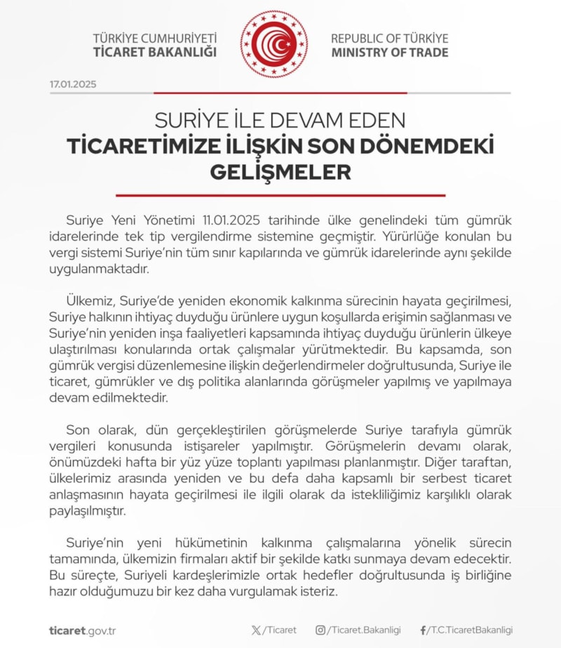 Suriye’nin yeni hükümetinin kalkınma çalışmalarına yönelik sürecin tamamında, ülkemizin firmaları aktif bir şekilde katkı sunmaya devam edecektir. Bu süreçte, Suriyeli kardeşlerimizle ortak hedefler doğrultusunda iş birliğine hazır olduğumuzu bir kez daha vurgulamak isteriz.