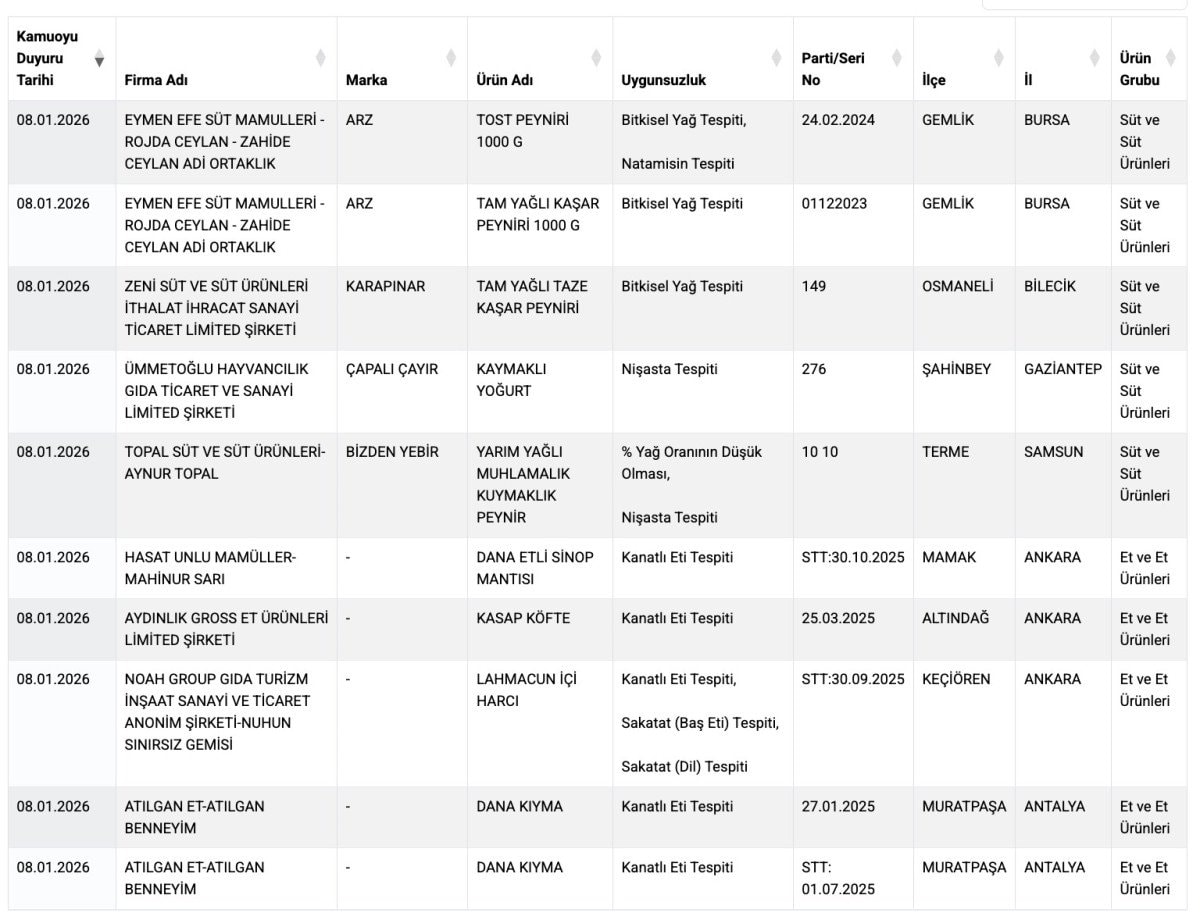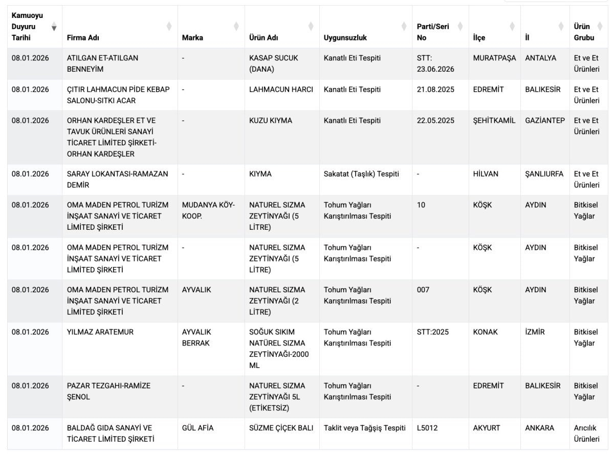 Buna göre listede, kanatlı eti ve sakatat tespiti ile taklit, tağşiş, bitkisel yağ ve nişasta tespiti gibi birçok uygunsuzluk içeren yeni ürünler de yer aldı.