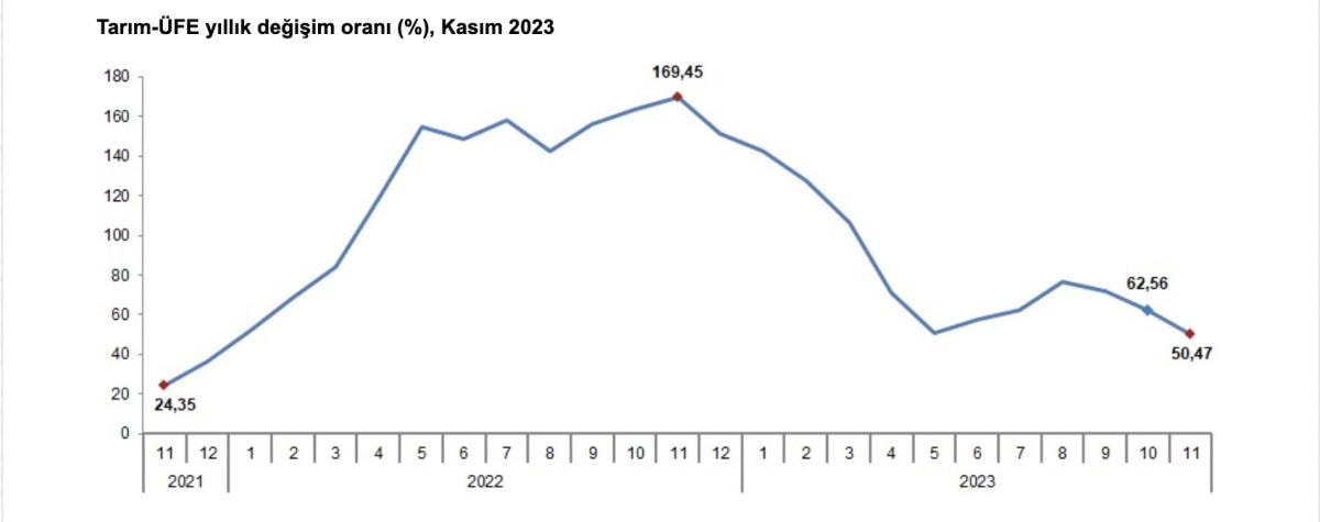 Tarım ÜFE kasımda bir önceki aya göre yüzde 0,95 azaldı, geçen yılın aynı ayına kıyasla yüzde 50,47 artış gösterdi.