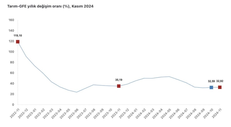 Buna göre, Tarım-GFE’de, 2024 yılı Kasım ayında; bir önceki aya göre yüzde 1,41 artış, bir önceki yılın aralık ayına göre yüzde 29,72 artış, bir önceki yılın aynı ayına göre yüzde 32,92 artış ve on iki aylık ortalamalara göre yüzde 41,64 artış gerçekleşti.