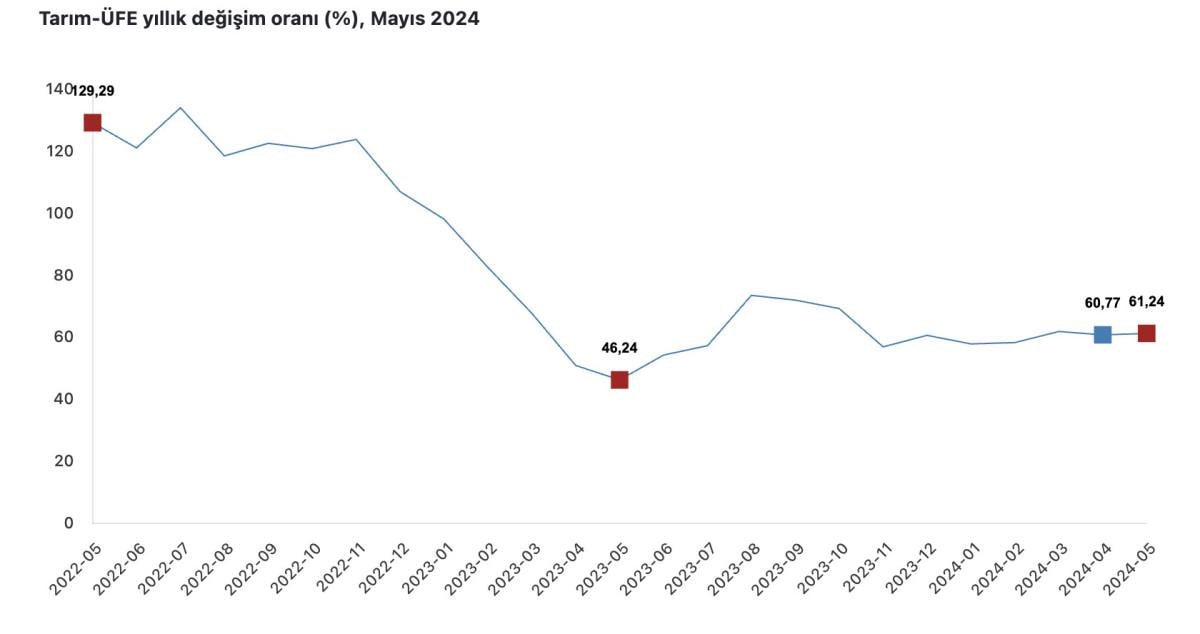 Tarım-ÜFE'de 2024 yılı Mayıs ayında, bir önceki aya göre yüzde 0,91 azalış, bir önceki yılın aralık ayına göre yüzde 19,58 artış, bir önceki yılın aynı ayına göre yüzde 61,24 artış ve on iki aylık ortalamalara göre yüzde 61,72 artış gerçekleşti.