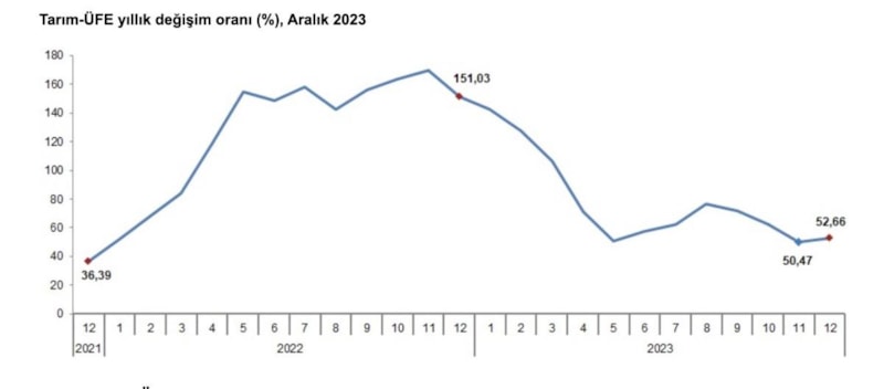 Türkiye İstatistik Kurumu (TÜİK) verilerine göre; Tarım-ÜFE'de, 2023 yılı Aralık ayında bir önceki aya göre yüzde 6,34 artış, bir önceki yılın aralık ayına göre yüzde 52,66 artış, bir önceki yılın aynı ayına göre yüzde 52,66 artış ve 12 aylık ortalamalara göre yüzde 72,04 artış gerçekleşti.