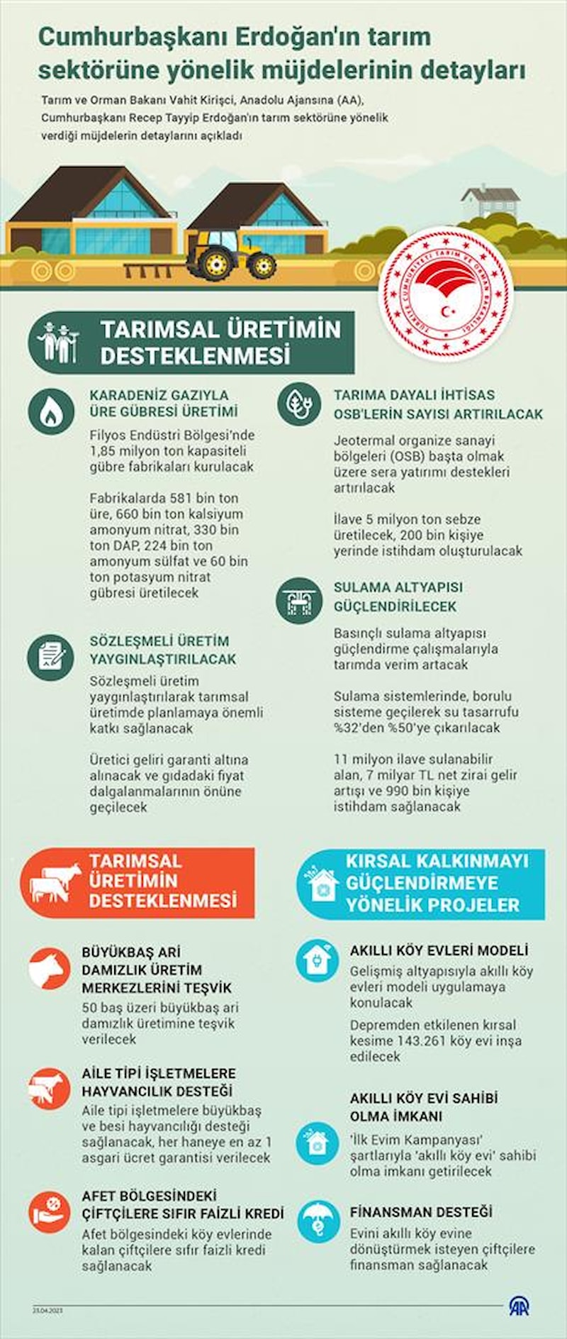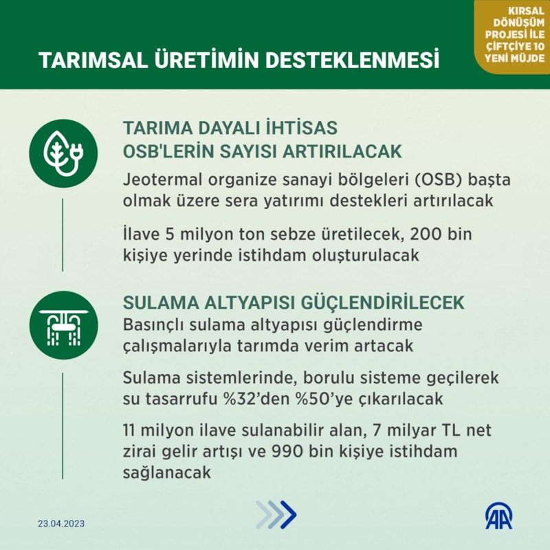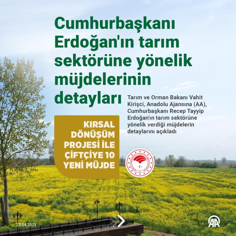 Tarım ve Orman Bakanı Vahit Kirişci, Cumhurbaşkanı Erdoğan'ın "Kırsal Dönüşüm Projesi" ile çiftçilere 10 yeni müjde açıkladığını anımsattı.