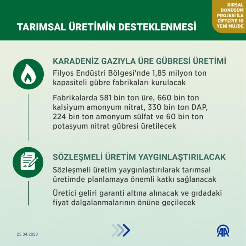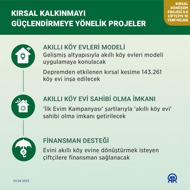 8. projemizle, gelişmiş altyapısıyla akıllı köy evleri modelini ortaya koyuyoruz. Depremden etkilenen kırsal kesime 143 bin 261 köy evi inşa edeceğiz. 22 Nisan'da Kahramanmaraş'ın Türkoğlu ve Gaziantep Nurdağı ilçelerimizdeki köylerimizde köy evlerini vatandaşlarımıza teslim ettik. 9. projemizle, 'İlk Evim Kampanyamız' şartlarıyla 'akıllı köy evi' sahibi olma imkanı getiriyoruz.10. projemizle, evini 'akıllı köy evine' dönüştürmek isteyen çiftçimize destek veriyoruz. Her birinin tarımımıza ve ülkemize büyük katkılar vereceğine inandığım 10 altın müjdenin sektörümüz için hayırlı ve uğurlu olmasını diliyorum.