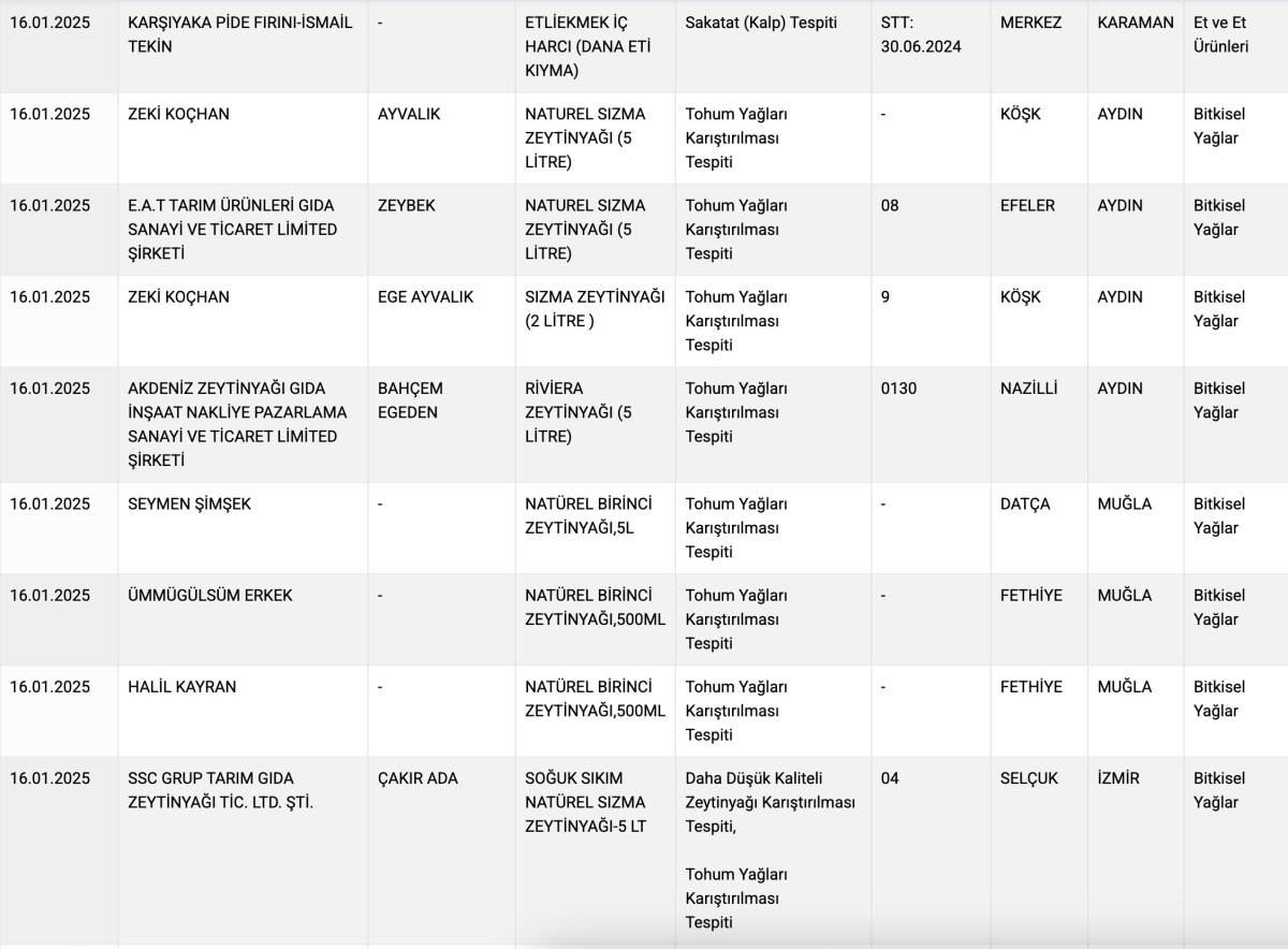 Öte yandan listede et ürünlerinin yanı sıra sızma ve zeytinyağı üretiminde tohum yağı kullanımı da dikkat çekti.
