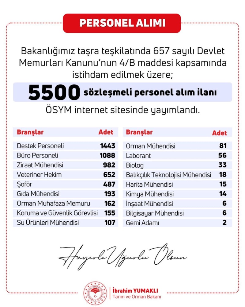 Tarım ve Orman Bakanı Yumaklı, sosyal medya hesabından Bakanlıkta istihdam edilecek 5 bin 500 kişinin alımına ilişkin süreci başlattıklarını bildirdi. Bakan Yumaklı'nın paylaşımında, alınacak personelin branşları da ayrıntılarıyla belirtiliyor.