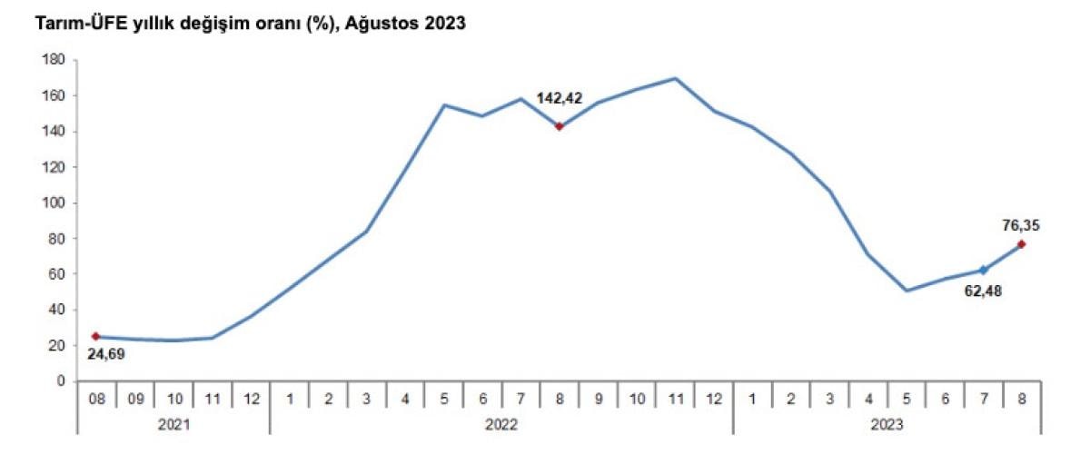Ağustos ayı için yayınlanan verilere göre, tarım ürünleri üretici fiyat endeksi (Tarım-ÜFE), 2023 yılı Ağustos ayında bir önceki aya göre yüzde 3,83 artış, bir önceki yılın aralık ayına göre yüzde 40,31 artış, bir önceki yılın aynı ayına göre yüzde 76,35 artış ve on iki aylık ortalamalara göre yüzde 97,21 artış gerçekleşti.