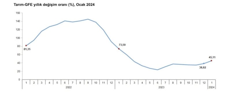 Tarım-GFE'de 2024 yılı Ocak ayında, bir önceki aya göre yüzde 7,51, bir önceki yılın Aralık ayına göre yüzde 7,51, bir önceki yılın aynı ayına göre yüzde 45,11 ve on iki aylık ortalamalara göre yüzde 36,81 artış gerçekleşti.