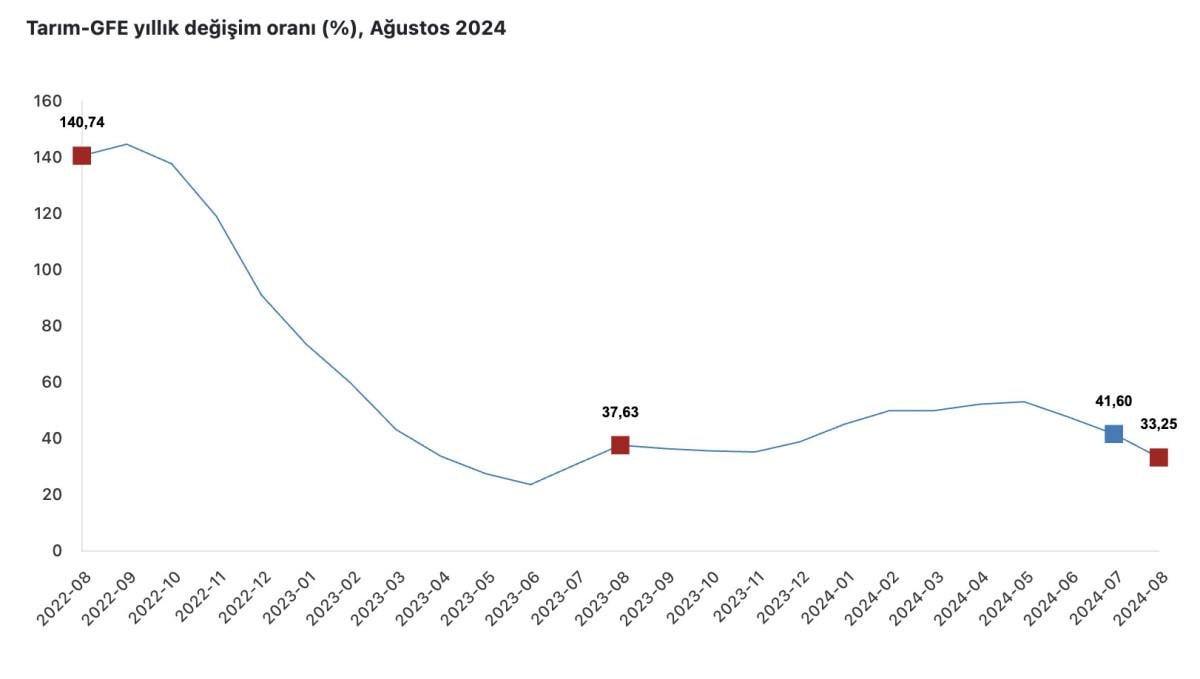 Tarımsal girdi fiyat endeksi 2024 yılı Ağustos ayında, bir önceki aya göre yüzde 1,39 artış, bir önceki yılın aralık ayına göre yüzde 22,33 artış, bir önceki yılın aynı ayına göre yüzde 33,25 artış ve on iki aylık ortalamalara göre yüzde 43,15 artış gerçekleşti.