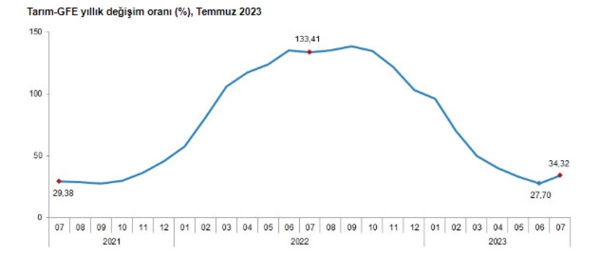Tarımsal girdi fiyat endeksi Tarım-GFE'de 2023 yılı Temmuz ayında, bir önceki aya göre yüzde 6,56, bir önceki yılın aralık ayına göre yüzde 21,29, bir önceki yılın aynı ayına göre yüzde 34,32 ve on iki aylık ortalamalara göre yüzde 69,23 artış gerçekleşti.