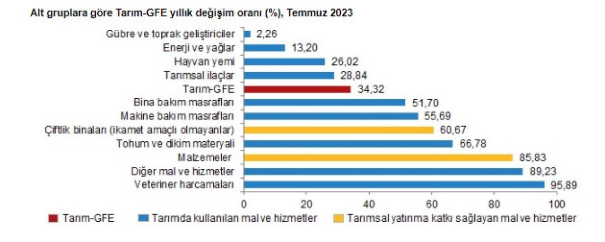 Bir önceki yılın aynı ayına göre artışın az olduğu alt gruplar yüzde 2,26 ile gübre ve toprak geliştiriciler ve yüzde 13,20 ile enerji ve yağlar oldu. Yıllık artışın yüksek olduğu alt gruplar ise sırasıyla, yüzde 95,89 ile veteriner harcamaları ve yüzde 89,23 ile diğer mal ve hizmetler oldu.