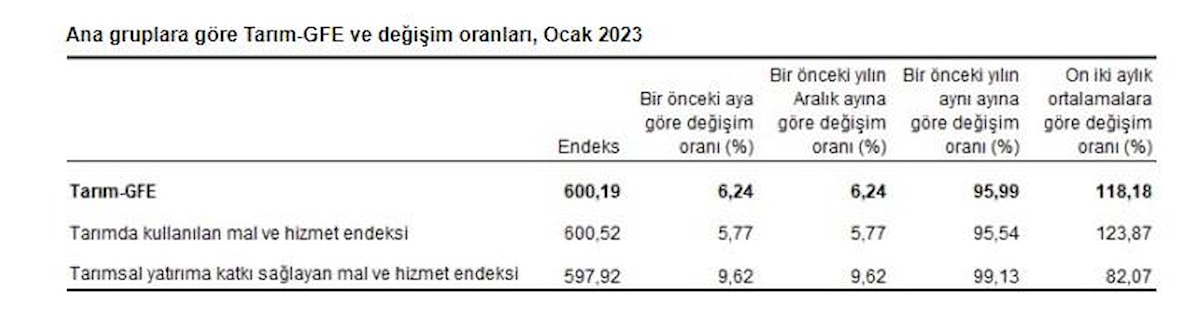 Tarım-GFE'de, 2023 yılı Ocak ayında bir önceki aya göre yüzde 6,24, bir önceki yılın Aralık ayına göre yüzde 6,24, bir önceki yılın aynı ayına göre yüzde 95,99 ve on iki aylık ortalamalara göre yüzde 118,18 artış gerçekleşti.