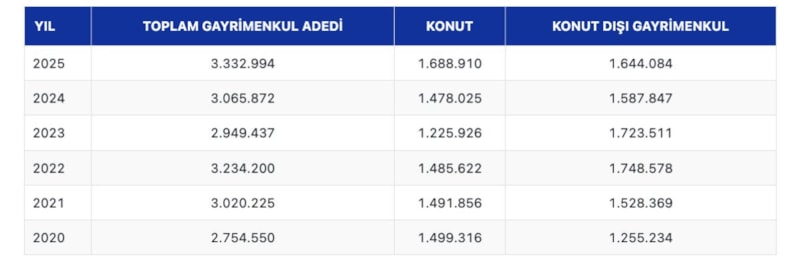 Büyük çoğunluğunu arsa ve tarlaların oluşturduğu konut dışı gayrimenkul satışları ise 2025'te, bir önceki yıla göre yüzde 3,5 artarak 1 milyon 644 bin 84 oldu.