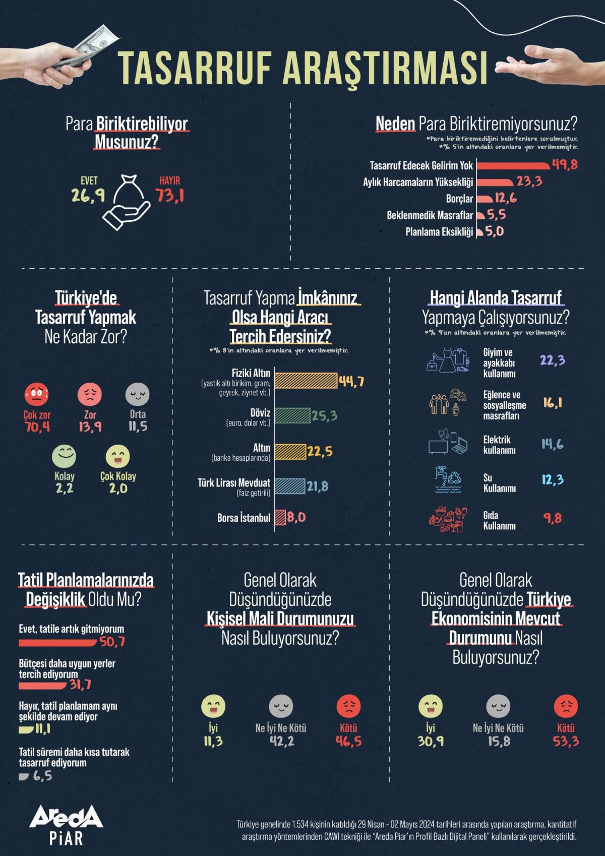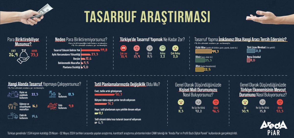Areda Piar araştırma şirketinin Türkiye genelinde bin 534 kişinin katılımıyla gerçekleştirdiği araştırmaya göre, Türk halkının yüzde 26,9'u para biriktirme hususunda bir sorun yaşamadığını ifade ederken yüzde 73,1'i para biriktiremiyor.