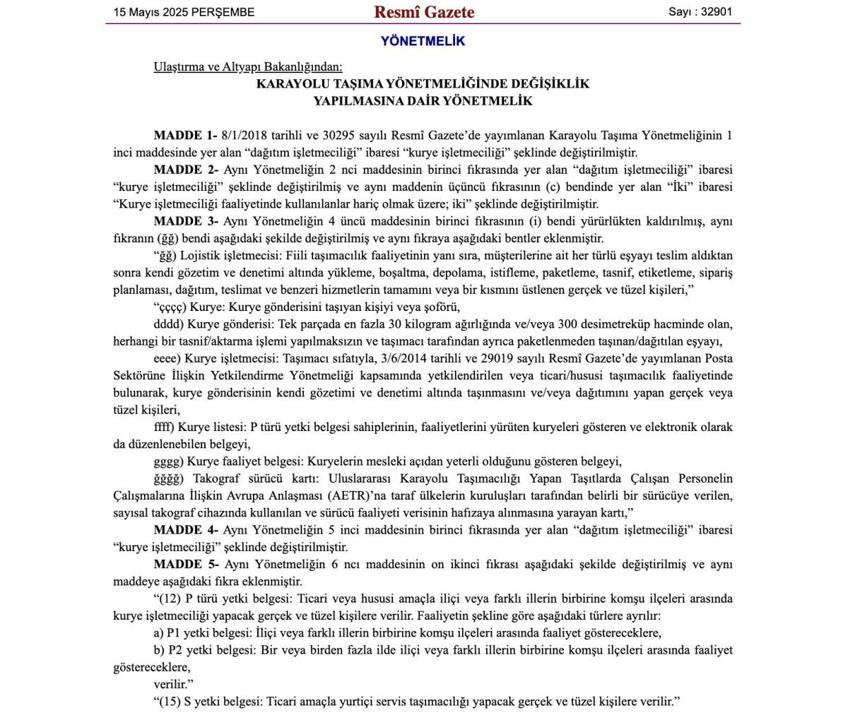 Karayolu Taşıma Yönetmeliğinde Değişiklik Yapılmasına Dair Yönetmelik, 15 Mayıs 2025 tarihli Resmi Gazete’de yayınlanarak yürürlüğe girdi.