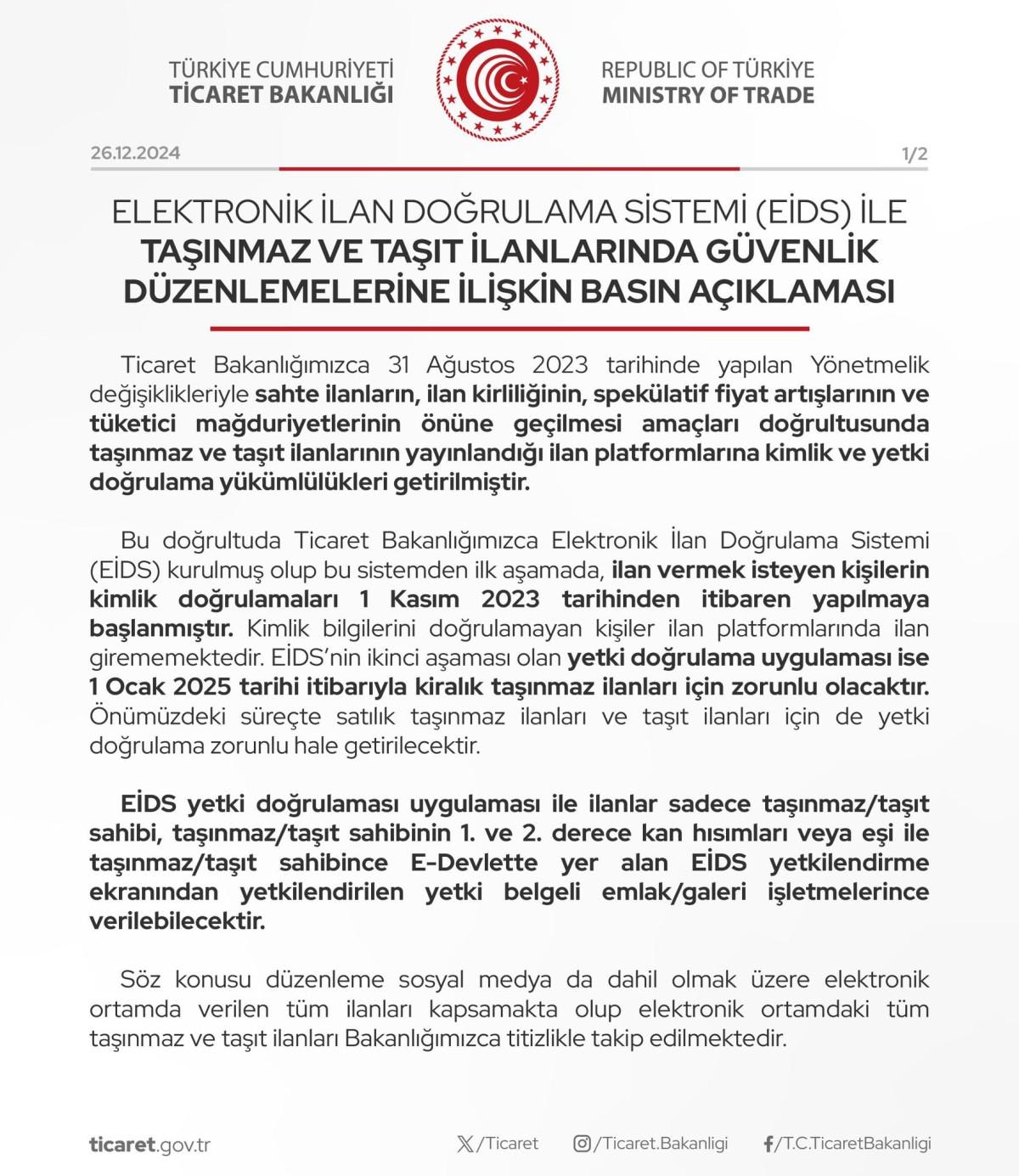 Ticaret Bakanlığı, EİDS ile taşınmaz ve taşıt ilanlarında güvenlik düzenlemelerine ilişkin, taşınmaz ve taşıt ilanlarının yayınlandığı ilan platformlarına kimlik ve yetki doğrulama yükümlülükleri getirildiğini duyurdu.