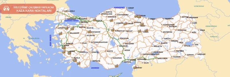 Türkiye genelindeki kara yollarında kazaların yoğunlaştığı bölgeleri görebiliyor, veriye dayalı olarak riskli bölge tespiti yapılabiliyor, bu kara noktalar üzerinde alınabilecek önleyici tedbirlerin planlanmasına katkı sağlıyor.