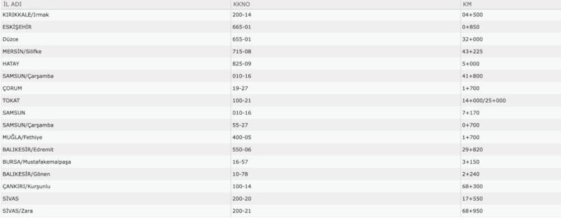 Çankırı Kurşunlu’da 100-14 kodlu 68,3. kilometre ve Sivas ile Zara ilçelerinde 200-20 ve 200-21 kodlu 17,55 ve 68,95. kilometreler de riskli noktalar arasında yer alıyor.