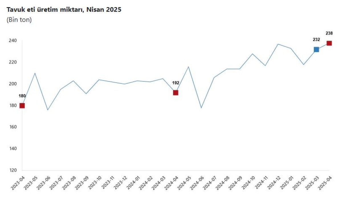 Buna göre; bir önceki ay 231 bin 595 ton olan tavuk eti üretimi, nisan ayında yüzde 2,6 oranında artarak 237 bin 567 ton oldu.