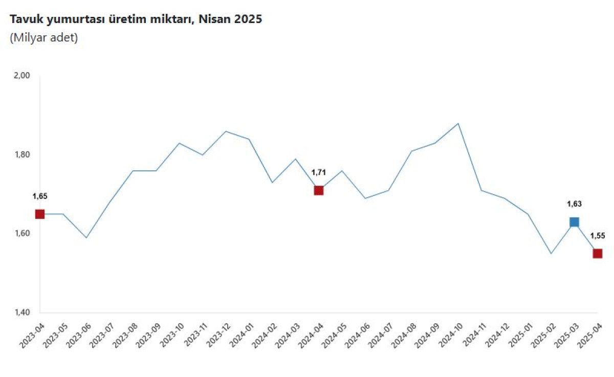 Bir önceki ay 1 milyar 632 milyon 774 bin adet olan tavuk yumurtası üretimi de nisan ayında yüzde 5 oranında azalarak 1 milyar 551 milyon 765 bin adet oldu.