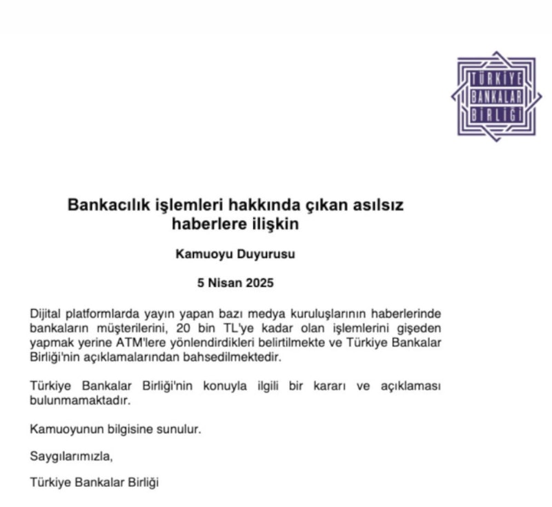 Dijital platformlarda yayın yapan bazı medya kuruluşlarının haberlerinde bankaların müşterilerini, 20 bin TL'ye kadar olan işlemlerini gişeden yapmak yerine ATM'lere yönlendirdikleri belirtilmekte ve Türkiye Bankalar Birliği'nin açıklamalarından bahsedilmektedir. Türkiye Bankalar Birliği'nin konuyla ilgili bir kararı ve açıklaması bulunmamaktadır.
