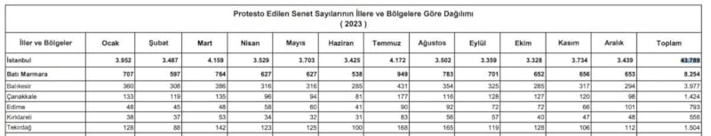 2023 yılında Malatya’da 2 bin 21, Erzurum’da bin 557, Van’da bin 270, Elazığ’da 646, Erzincan’da 386, Muş’ta 379, Ağrı’da 355, Iğdır’da 316, Kars’ta 283, Bitlis’te 294, Bingöl’de 214, Hakkari’de 243, Ardahan’da 136 ve Tunceli’de 38 senet protesto edildi.