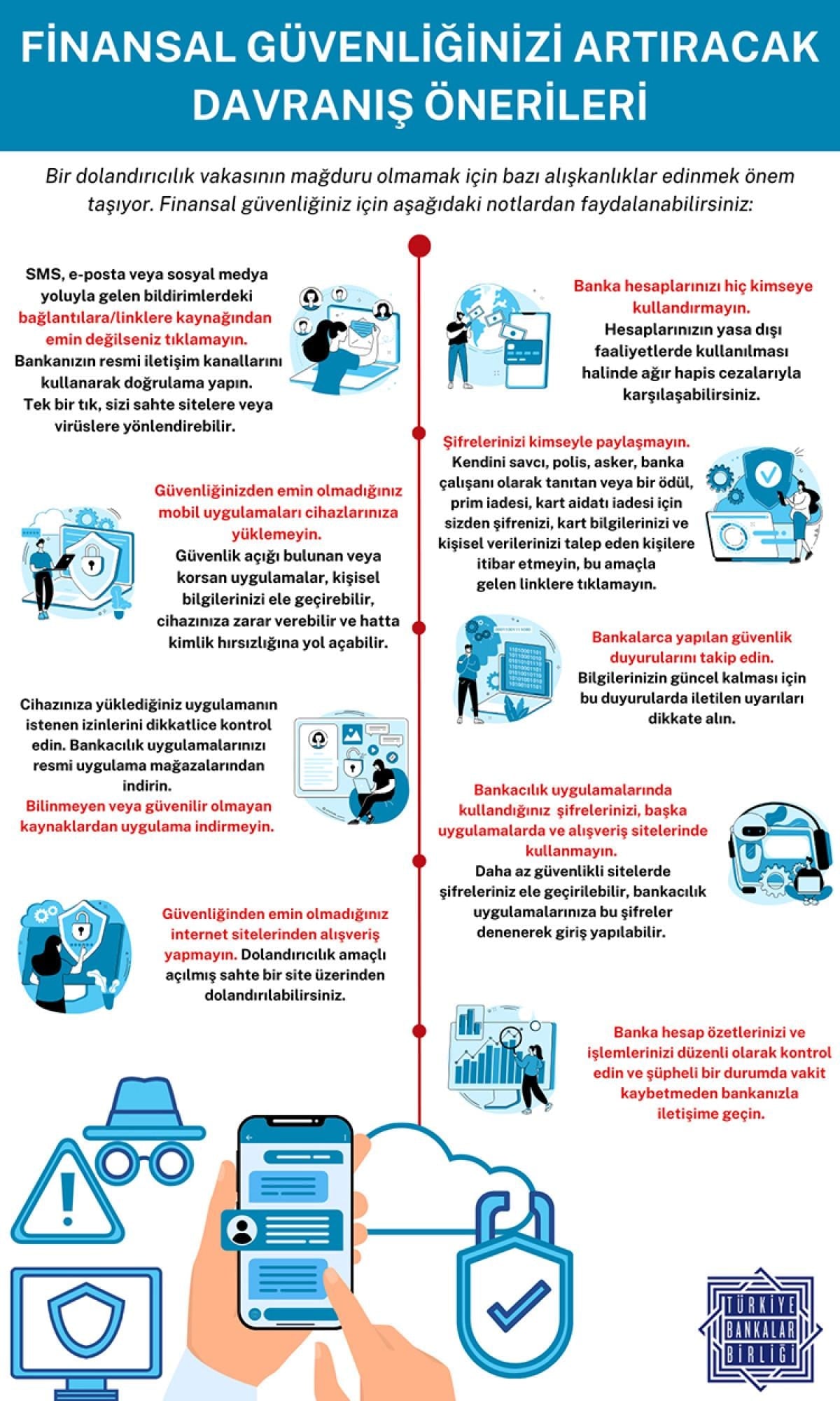 Türkiye Bankalar Birliği (TBB), vatandaşları bilinçlendirmek için oluşturduğu "Finansal Güvenliğinizi Artıracak Davranış Önerileri" konulu çalışmasıyla kullanıcıları dolandırıcılık mağduru olunmaması için uyardı.