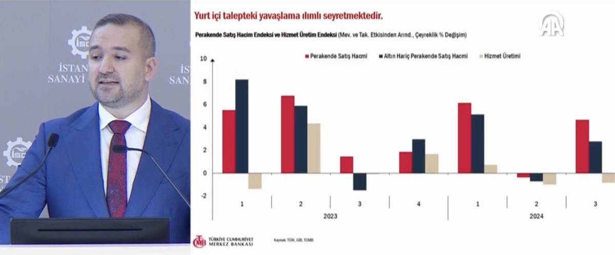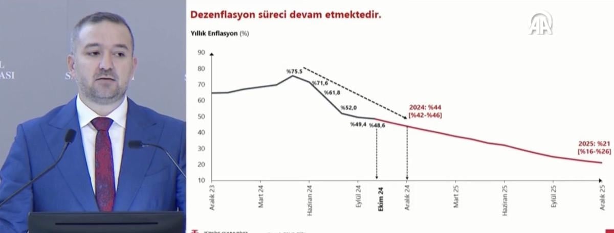 Fatih Karahan sunumunda, "Mart ayında yüzde 50'ye çıkarttığımız politika faizini 8 aydır koruyoruz. Para politikasındaki sıkı duruşumuzu, dezenflasyonun devamını sağlayacak şekilde sürdüreceğiz." diyerek faizin düşmeyeceği mesajı verdi.