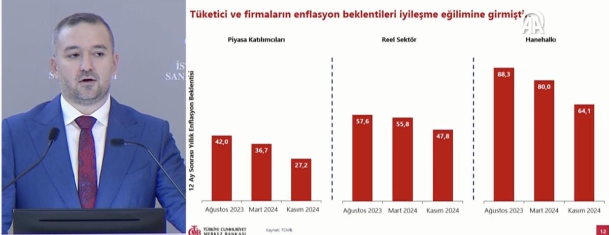 TCMB Başkanı Karahan, yıl sonu enflasyon hedefinin yüzde 44 olduğunu belirttiği sunumunda, "Piyasa katılımcılarının beklentileri görece daha düşük seviyelerde seyrediyor. Hanehalkının ve reel sektörün enflasyon beklentilerindeki iyileşme devam ediyor. Para politikasındaki kararlı duruşumuz yanında manşet enflasyondaki düşüşün de etkisi ile beklentilerdeki iyileşmenin devam etmesini bekliyoruz. " dedi.