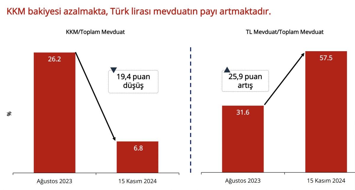 -KKM bakiyesi azalmakta, Türk lirası mevduatın payı artmaktadır. Kararlılıkla sürdürdüğümüz sıkı parasal duruşumuz ve KKM bakiyesinin azaltılmasına yönelik uygulamaların etkisiyle Türk Lirası varlıklara olan ilginin ve güvenin arttığını görüyoruz. 2023 Ağustos'ta 140 milyar doların üzerine çıkan KKM hesapları, kasım ayının ortasında 38 milyar dolar seviyesine geriledi. Vadesi dolan KKM hesaplarından TL'ye geçiş oranları yıl başında yüzde 10'lu seviyelerdeyken son dönemde yüzde 25'ler civarında.