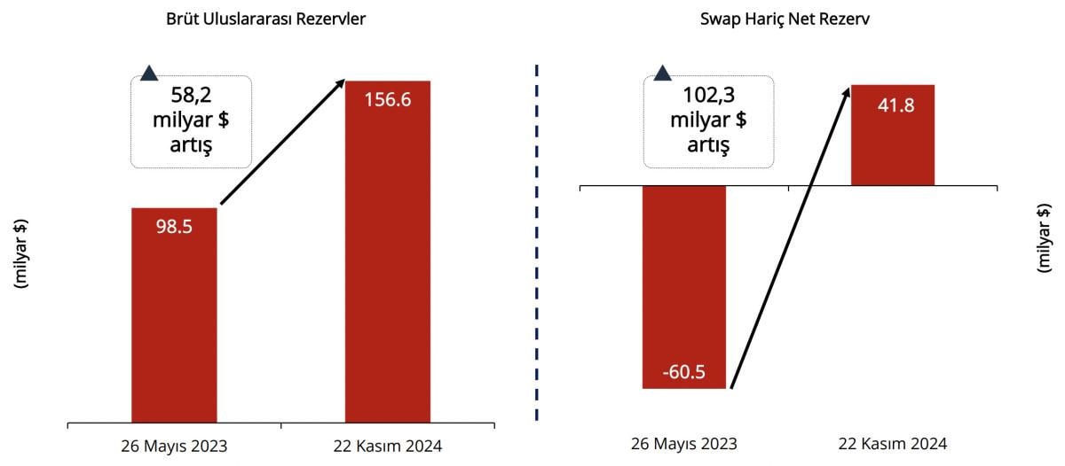 -Brüt rezervler arttı. Brüt rezervler 156 milyar doların üzerine çıktı. Swap hariç net döviz pozisyonumuz 102,3 milyar dolar iyileşti.