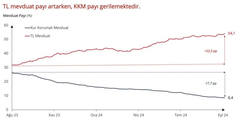 Mevduat gelişmeleri, TL'ye güvenin yeniden inşa edildiğini teyit ediyor. TL mevduatın payı yükselerek yüzde 54'e ulaştı. KKM'nin payı yüzde 8'lere geriledi.