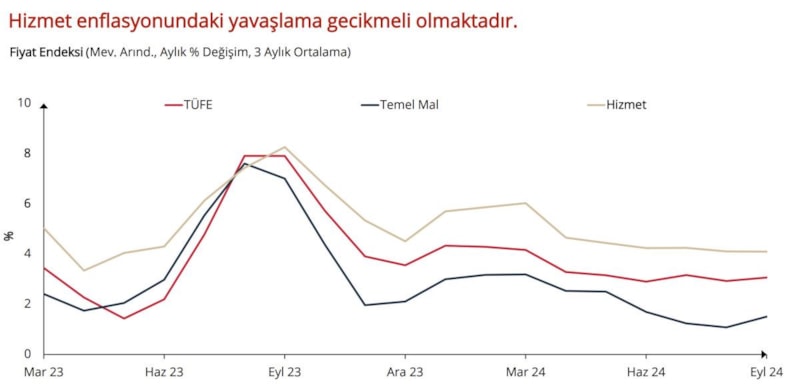 Hizmet enflasyonu yavaşlamaya devam etse de bu gruptaki fiyat artışları, diğer bir çekirdek grup olan temel mallara kıyasla güçlü seyrediyor ve manşet enflasyonu yukarıya çekiyor.