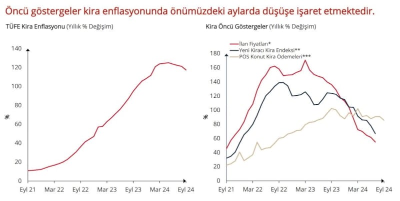Hizmet sektörü enflasyonunda ataleti besleyen en önemli grubun kira olduğunu görüyoruz. Nitekim, yıllık kira enflasyonu eylül ayı itibarıyla yüzde 117 ile yıllık hizmet enflasyonunun yaklaşık 45 puan üzerinde seyretmektedir. Buna karşın, öncü göstergeler bir süredir aşağı yönlü bir harekete işaret ediyor.