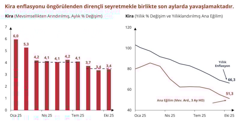 Yıllıklandırılmış son üç ay kira enflasyonu eğilimi yüzde 51 düzeyinde. Bu eğilim, mevcut yıllık kira enflasyonunun yaklaşık 15 puan altında ve kira enflasyonunun gerilemeye devam edeceğini gösteriyor. İnternet ilan fiyatları, konut kredisi değerleme raporları ve Perakende Ödeme Sistemi verilerinden elde edilen tüm öncü göstergeler, bu aşağı yönlü görünümü teyit ediyor.