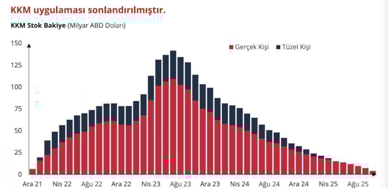 Karahan, Kur Korumalı Mevduat (KKM) bakiyeleri ile de ilgili olarak, "Hatırlayacağınız üzere, şubat ayında tüzel kişiler ve ağustos ayında da gerçek kişiler için KKM hesaplarının açılması ve yenilenmesi uygulamasını sonlandırdık. 2023 Ağustos'ta 140 milyar doların üzerine çıkan KKM bakiyesi 4 milyar ABD dolarının altına geriledi. KKM bakiyesinin kademeli olarak azaltılması ve TL mevduat payının artırılması parasal aktarım mekanizmasını güçlendirdi ve merkez bankası bilançosu üzerindeki riskleri azalttı. Bu yılın sonuna doğru, KKM hesapları büyük oranda kapanmış olacak." açıklamasında bulundu.