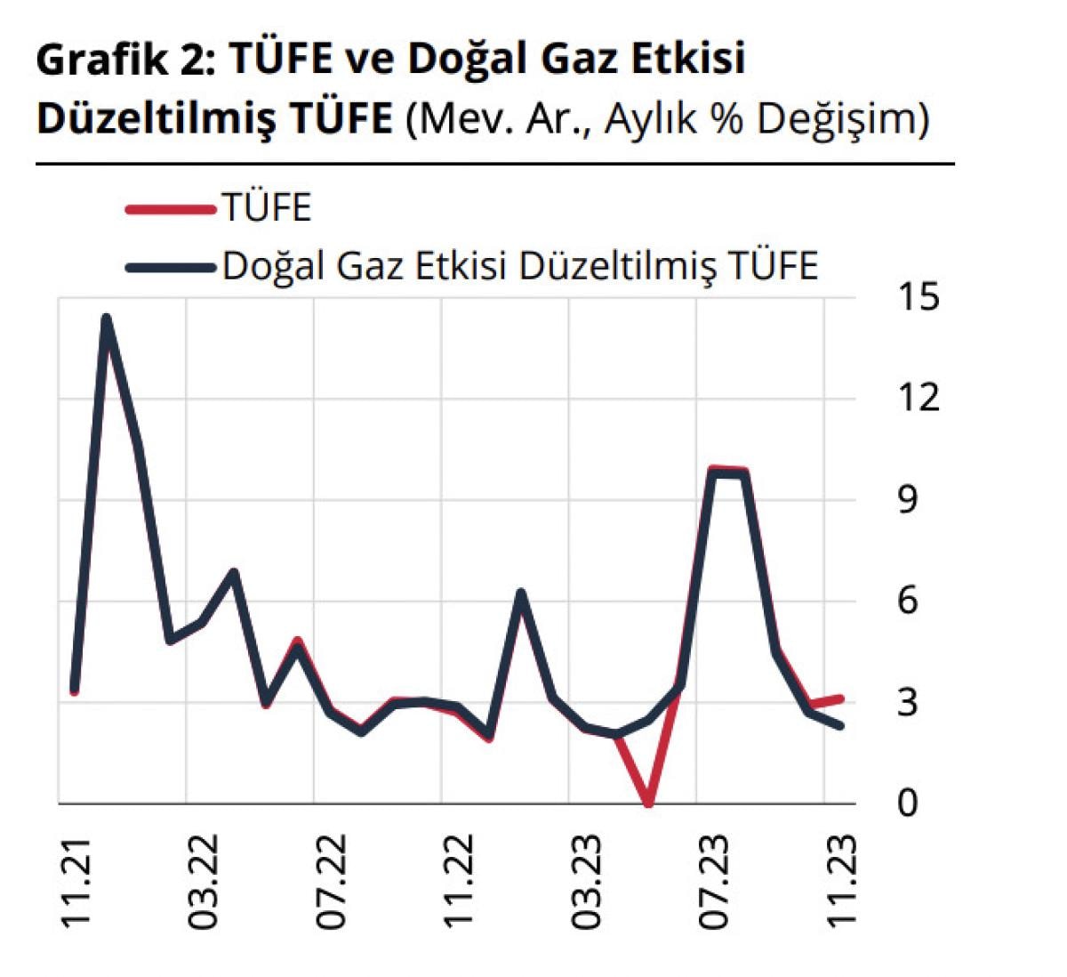 Doğalgazın aylık enflasyon üzerindeki katkısının aralık ayında zayıflayacağı öngörülmektedir. Doğalgaz etkisi hariç tutulduğunda ise tüketici fiyatları artış oranındaki yavaşlama eğilimi sürmüştür. Kasım ayında gıda grubunda taze meyve ve sebze fiyatları düşüş kaydederken, meyve ve sebze dışı gıdada fiyat artışları gücünü korumuştur.