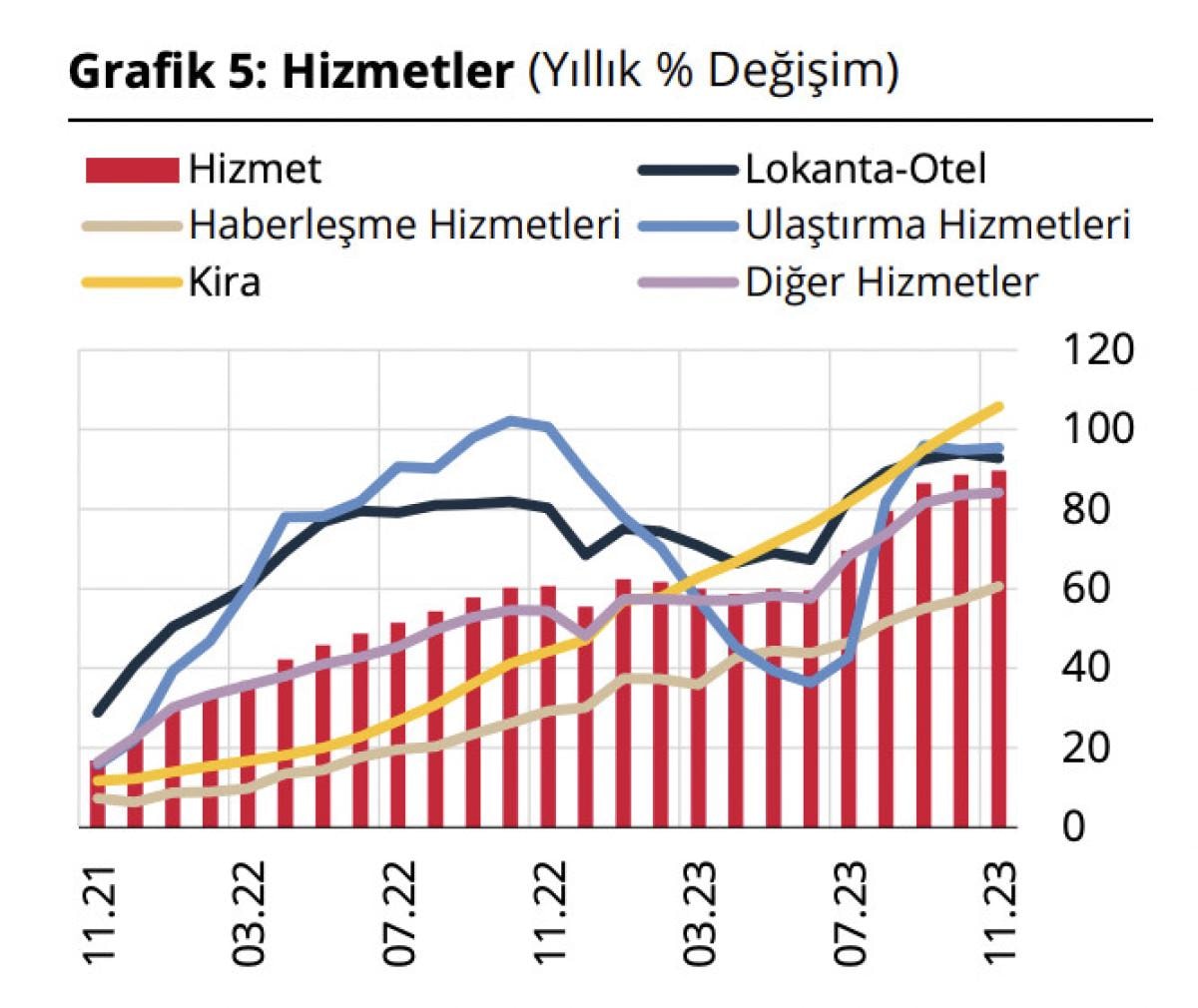 Hizmet fiyatları kasım ayında yüzde 2,76 oranında yükselmiş, grup yıllık enflasyonu 1,06 puan artışla yüzde 89,71 seviyesine ulaşmıştır. Bu dönemde, kira alt grubunda aylık artışın (yüzde 5,97) bir önceki aya kıyasla hız kesmesi dikkat çekmiş, diğer taraftan alt grup yıllık enflasyonu 5,14 puan artışla yüzde 105,81 seviyesine ulaşmıştır.