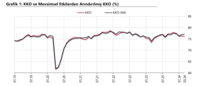 Mevsimsel etkilerden arındırılmış kapasite kullanım oranı ise (KKO-MA) geçen aya göre 0,2 puan artarak yüzde 77,2'ye yükseldi.