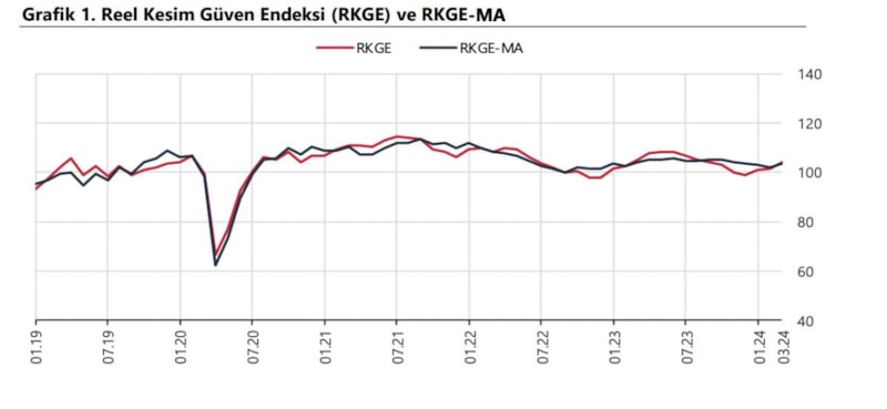 TCMB; 2024 yılı Mart ayında mevsimsellikten arındırılmış Reel Kesim Güven Endeksi (RKGE-MA), bir önceki aya göre 1,5 puan artarak 103,5 seviyesinde gerçekleştiğini duyurdu.