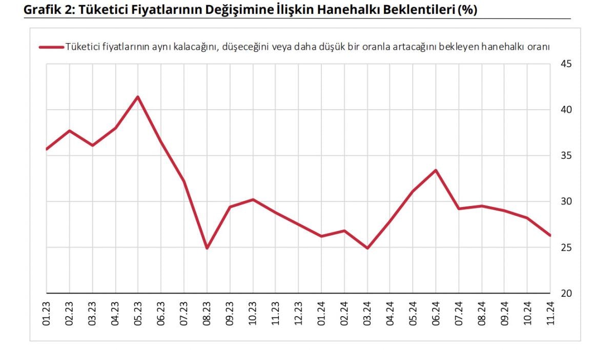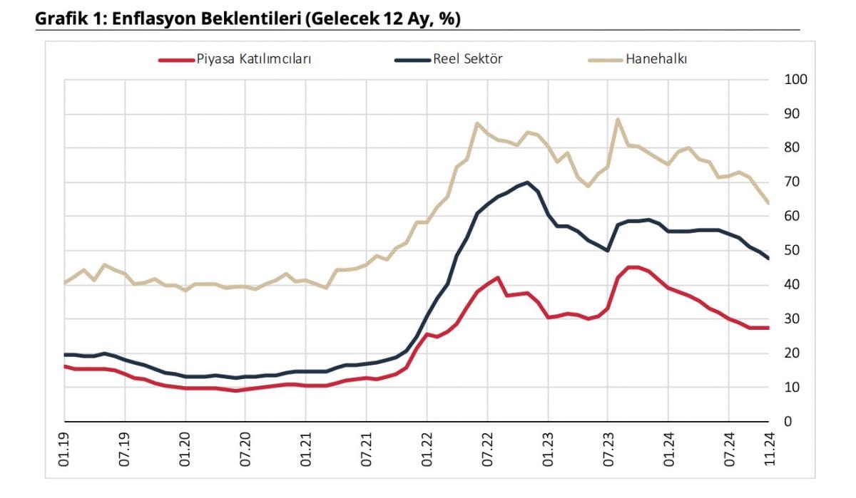 2024 yılı Kasım ayında 12 ay sonrası yıllık enflasyon beklentileri, piyasa katılımcıları için 0,2 puan azalarak yüzde 27,2 seviyesine, reel sektör için 1,7 puan azalarak yüzde 47,8 seviyesine, hanehalkı için 3,1 puan azalarak yüzde 64,1 seviyesine geriledi.